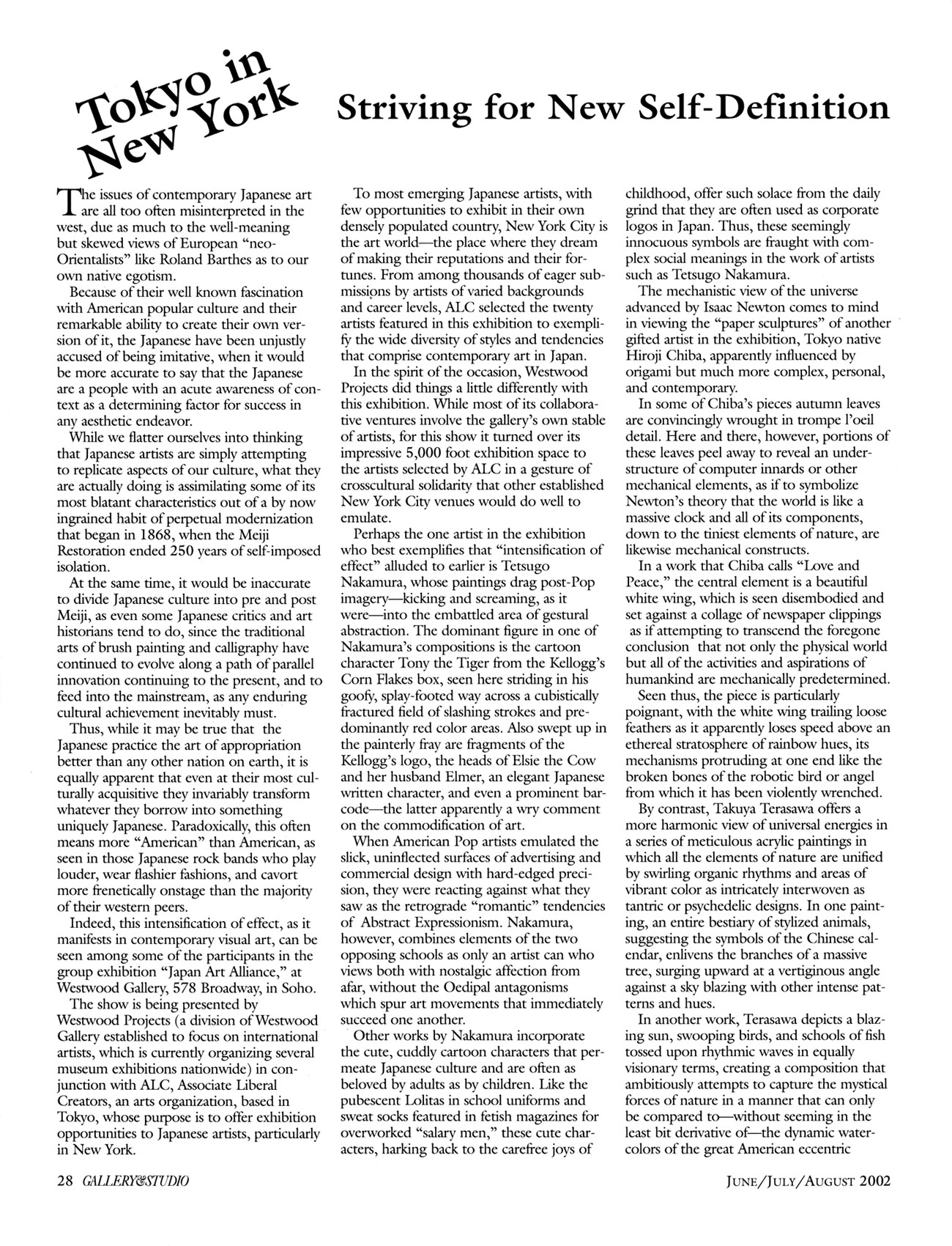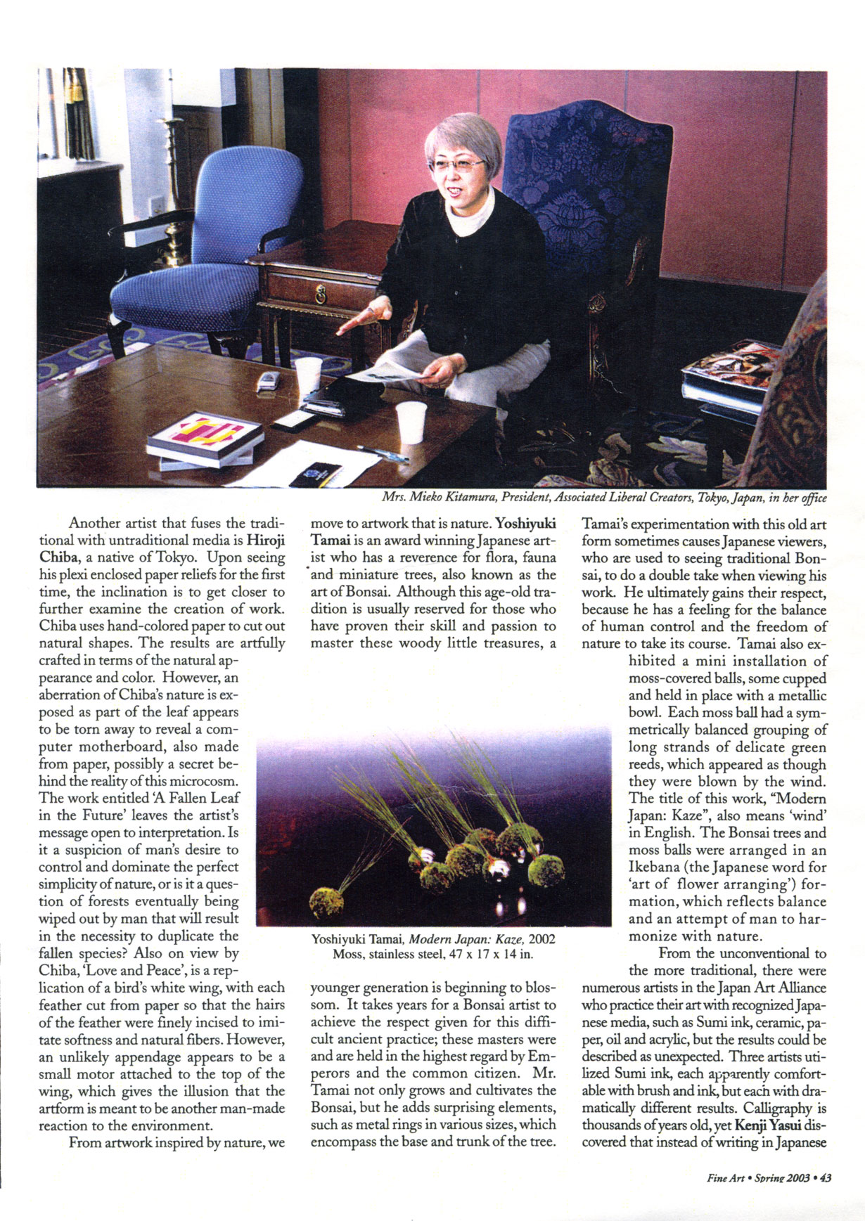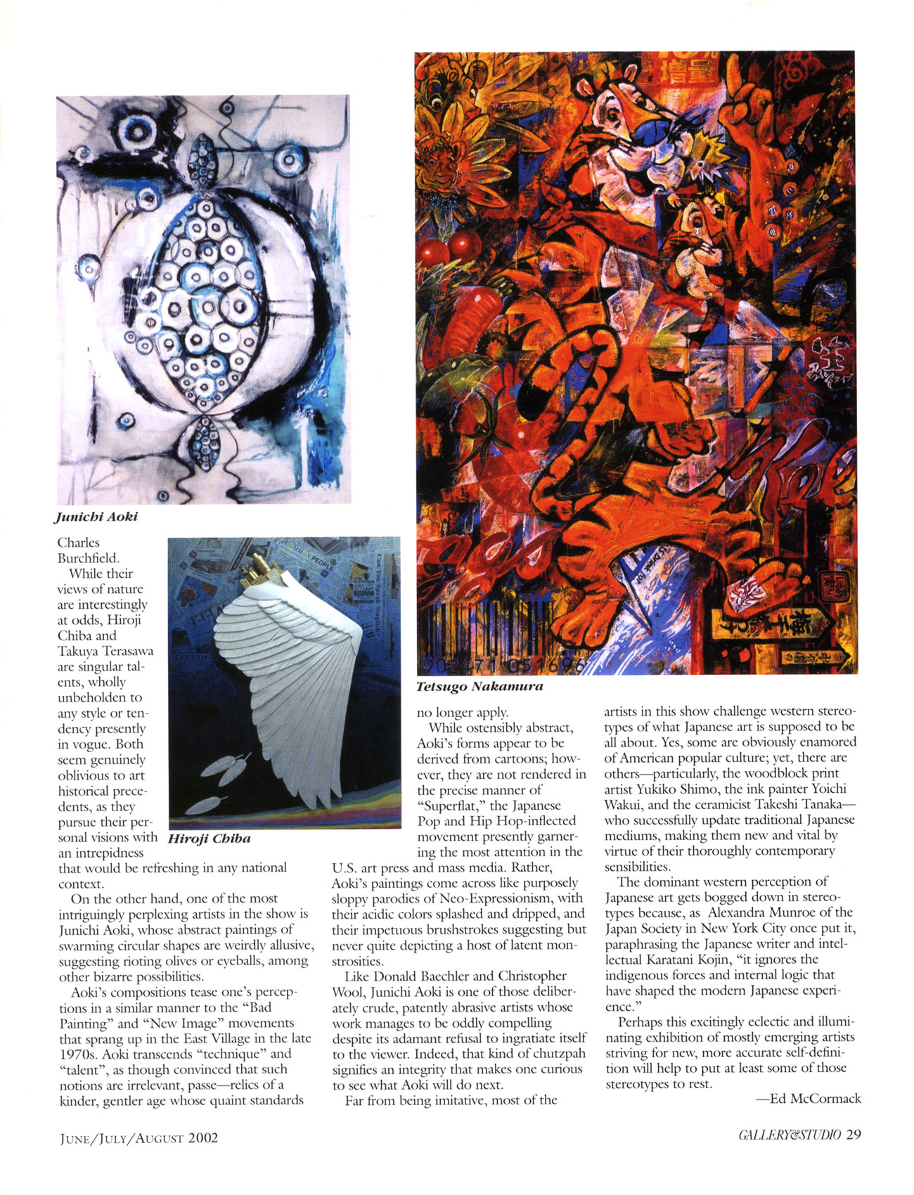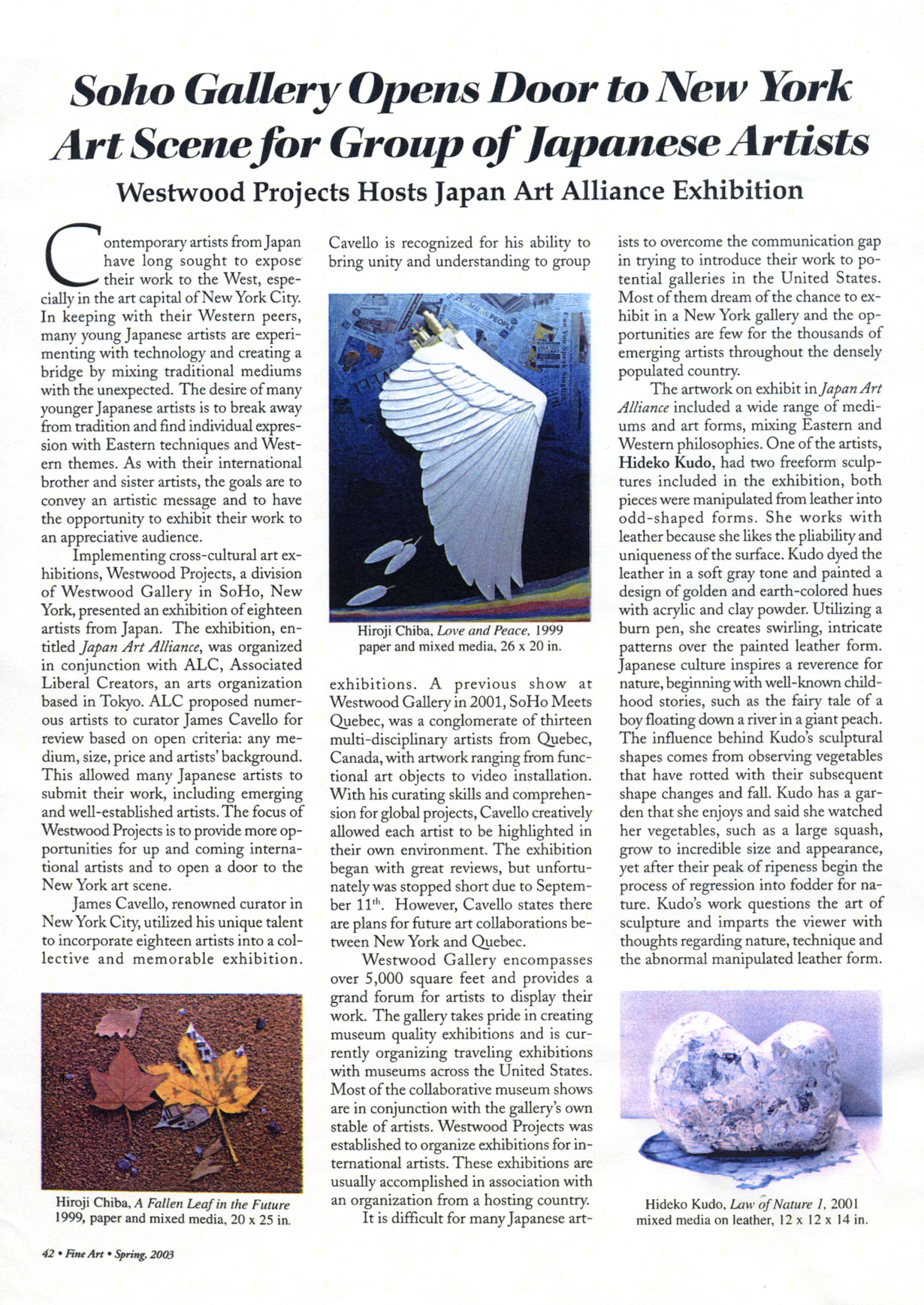 西欧、特に芸術の資本であるニューヨーク・シティにおいて、日本人現代アーティスト達の作品が長期間展示された。・・・伝統的素材と非伝統的素材を融合させた、もうひとりのアーティストは、東京出身の千葉浩司である。・・・